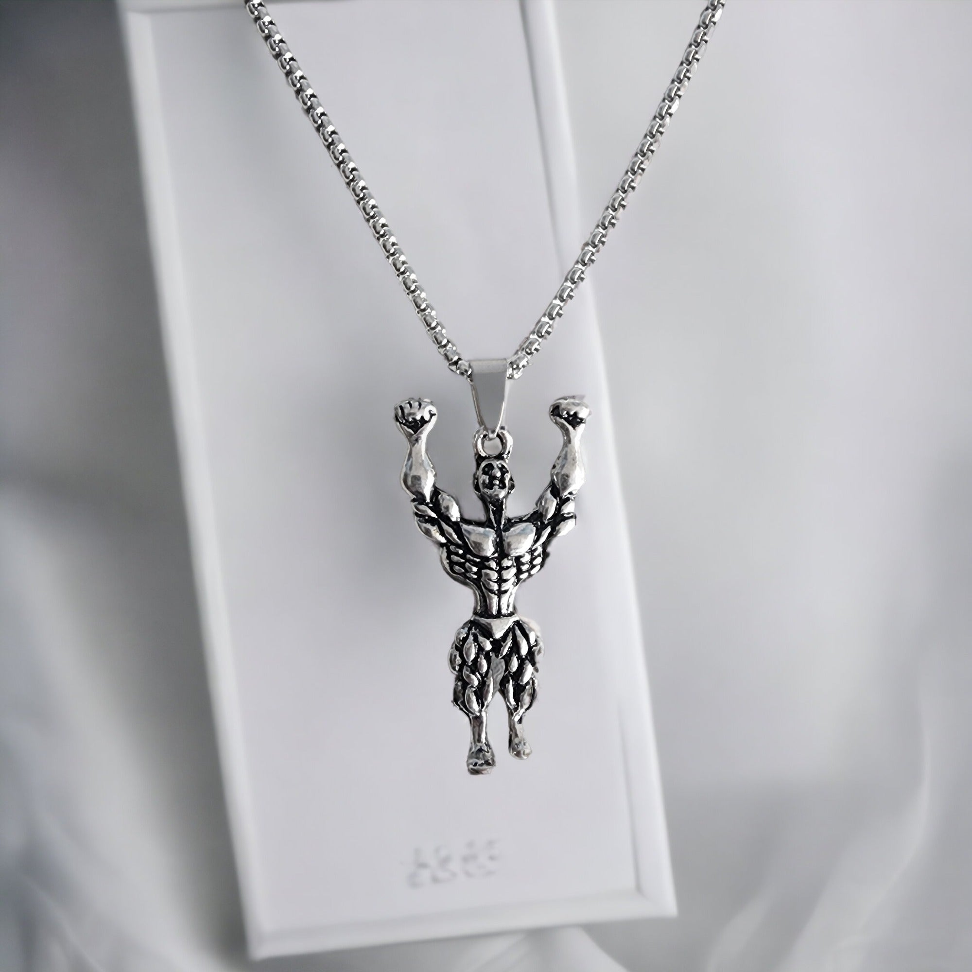 El dije del hombre musculoso está detallado y muestra tu aprecio por la fuerza y la salud. El collar de acero inoxidable es elegante y duradero.