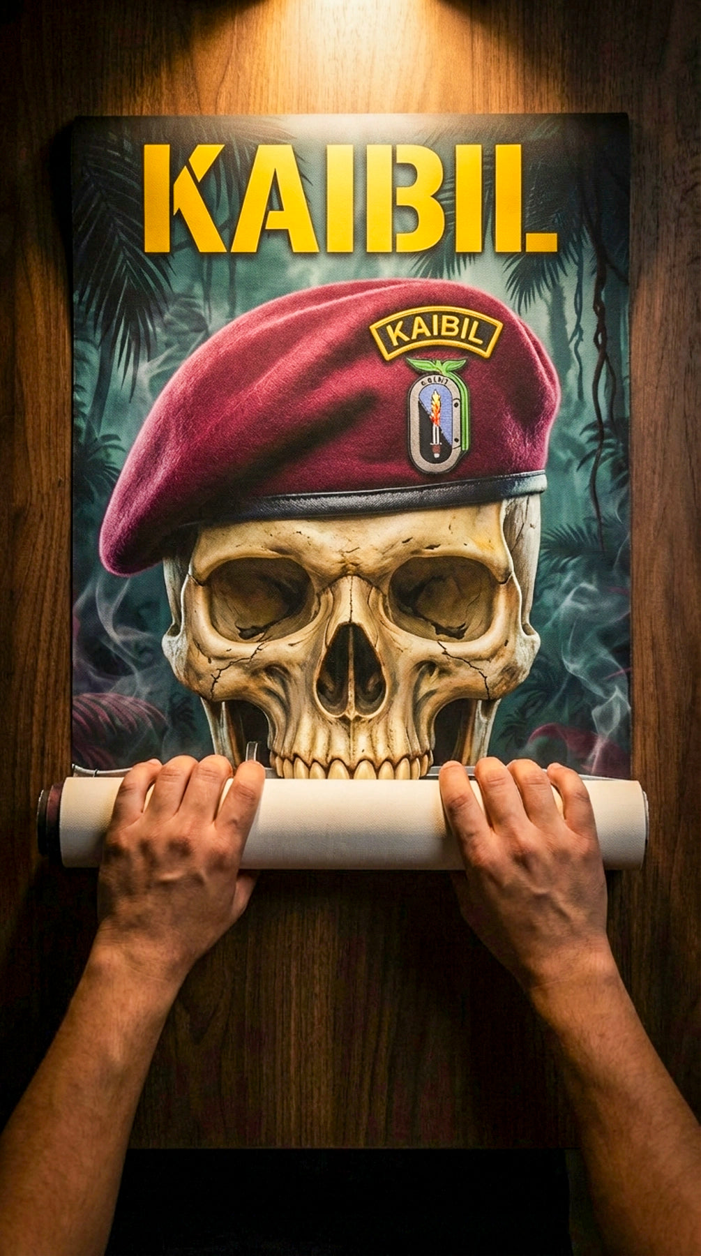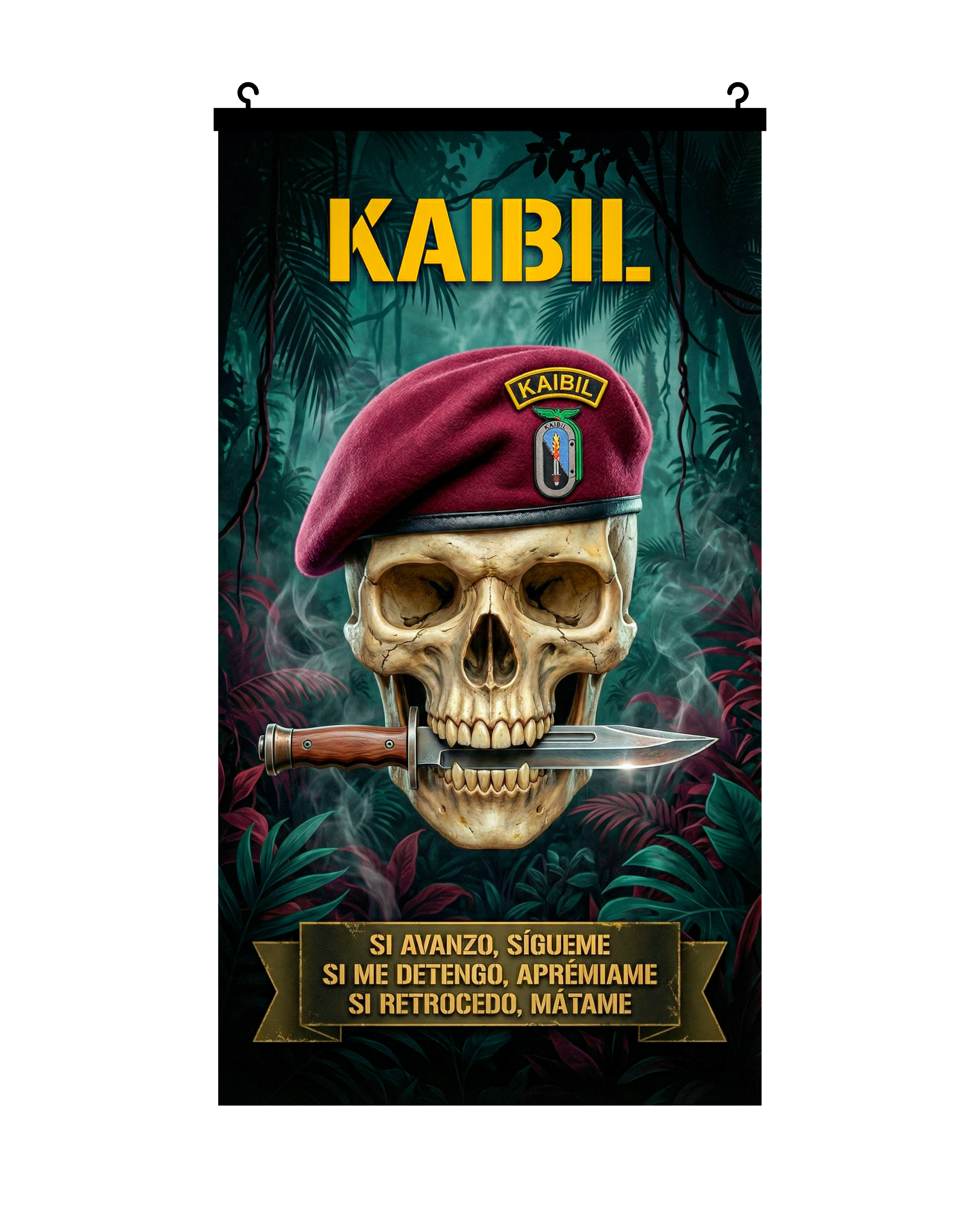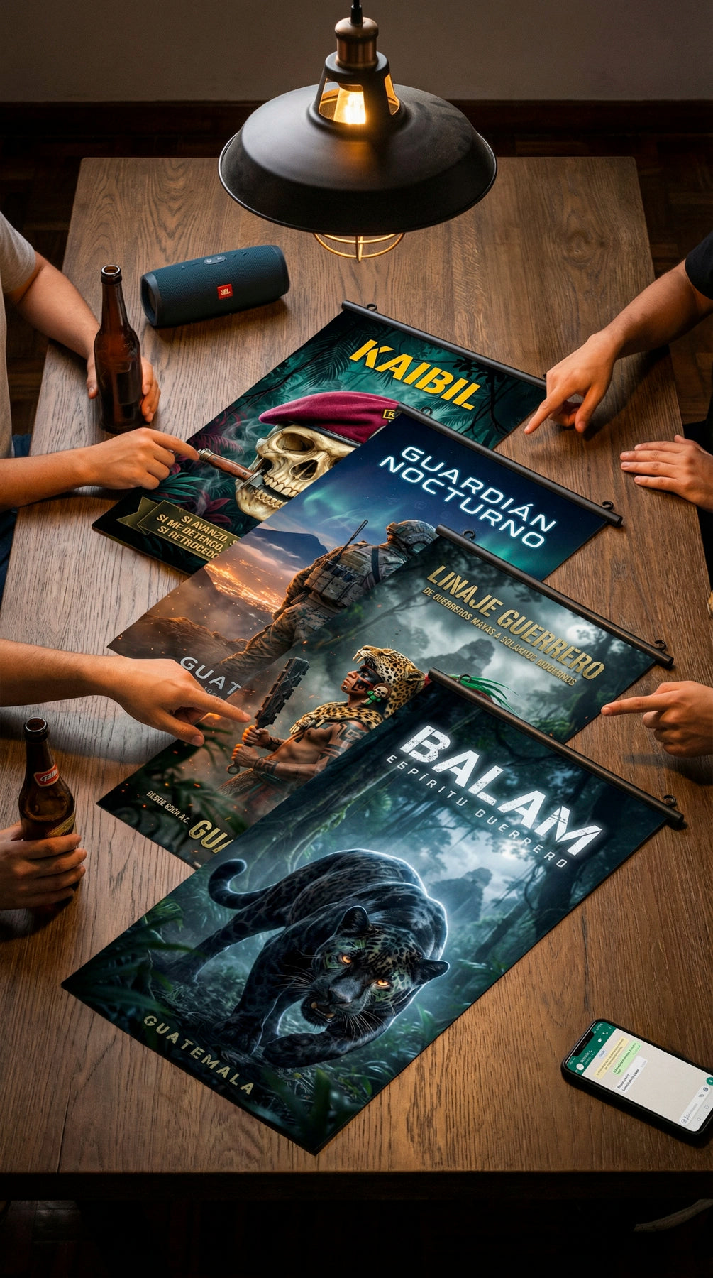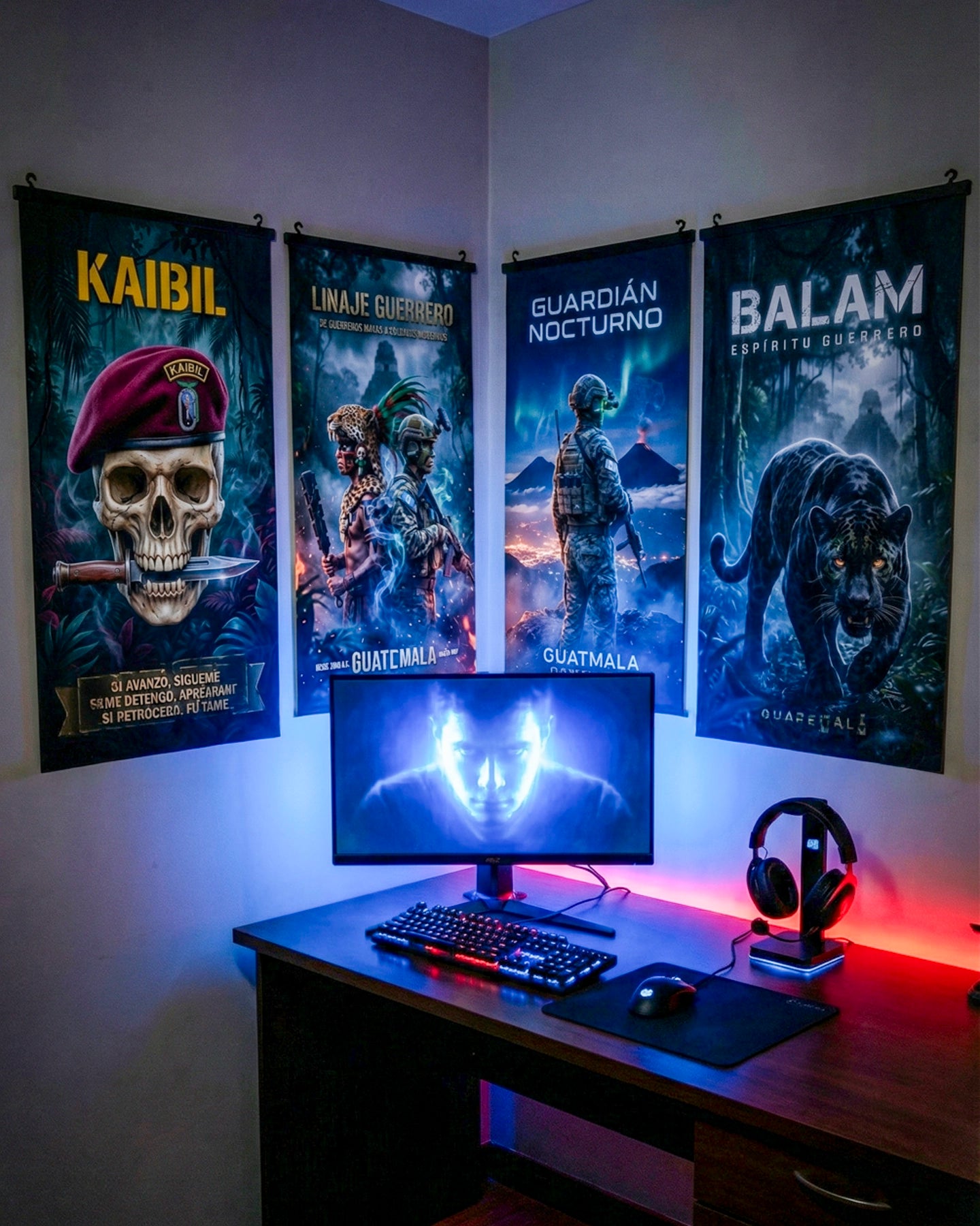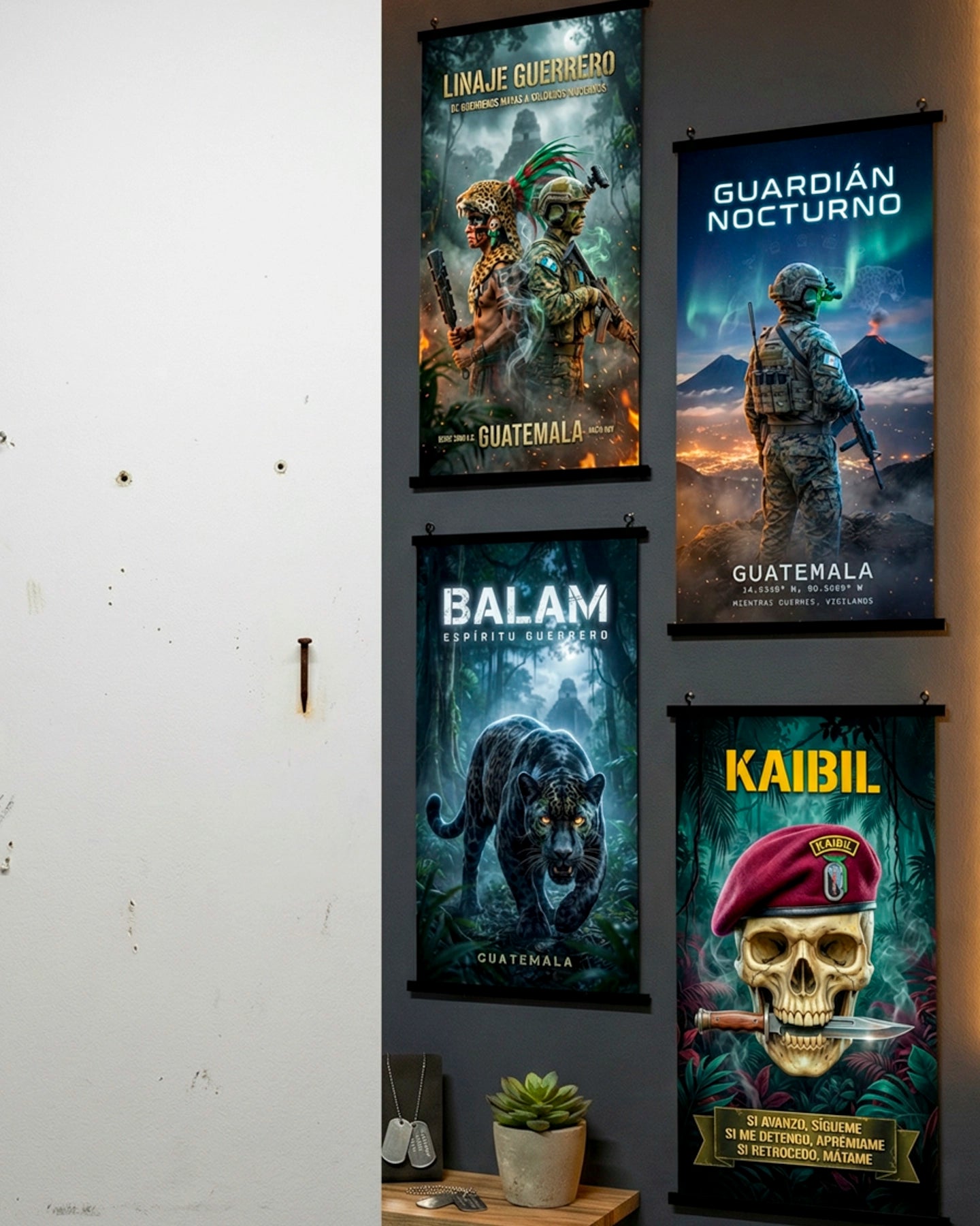 Colección de 4 pósters premium de temática militar guatemalteca: Kaibil, Linaje Guerrero, Guardián Nocturno y Balam. Impresión en material resisten...